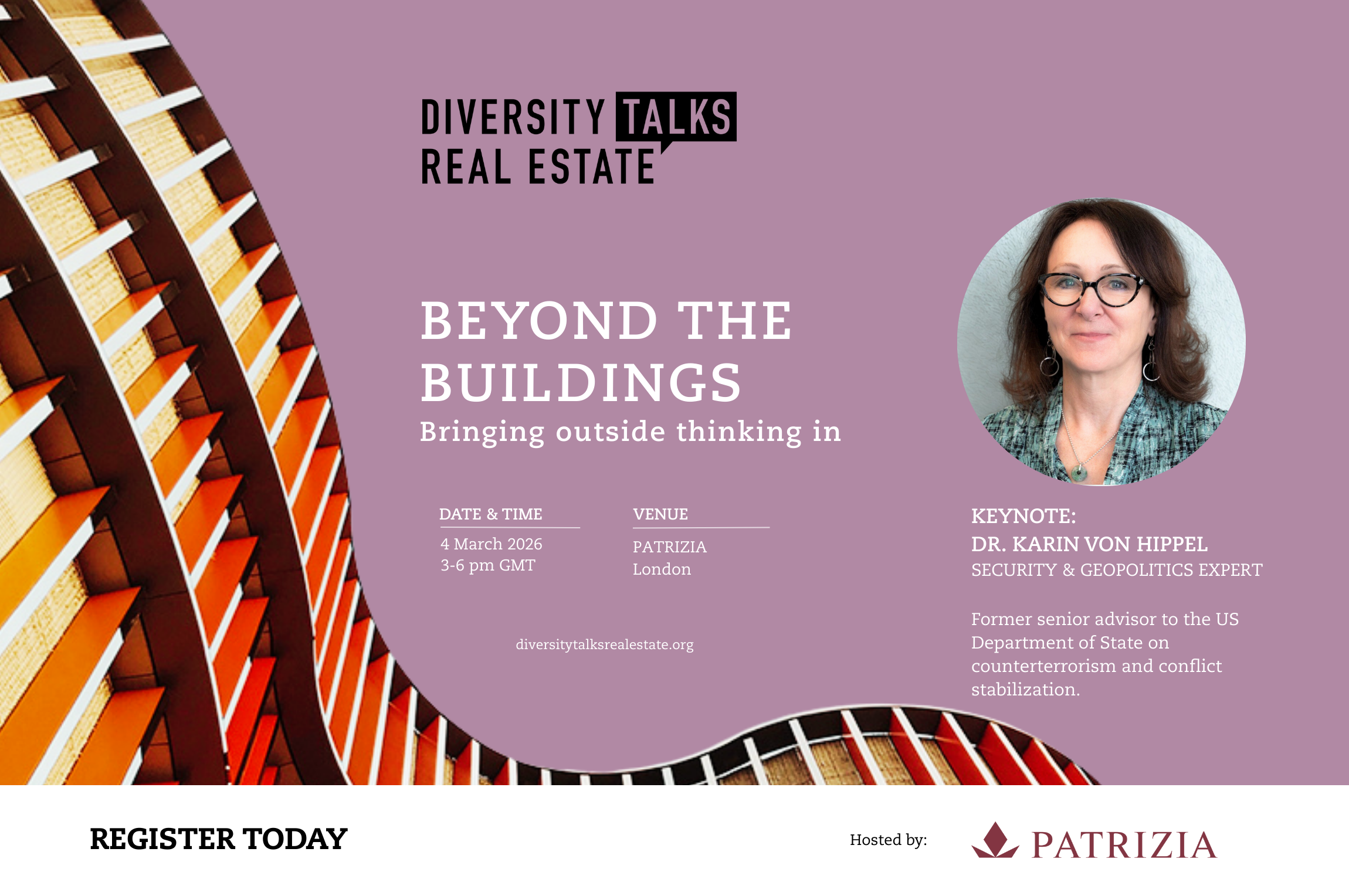 Beyond the Buildings is a series designed to bring bold, external perspectives into the real estate industry. The series opens with a compelling keynote from Dr. Karin von Hippel, a security and geopolitics expert and one of the world's leading voices on global affairs, security and policy. Her big-picture insights will focus on geopolitics and systemic change for global stability. An industry leaders panel will follow, discussing how global geopolitical trends are shaping the future of real estate with practical and inspiring viewpoints.